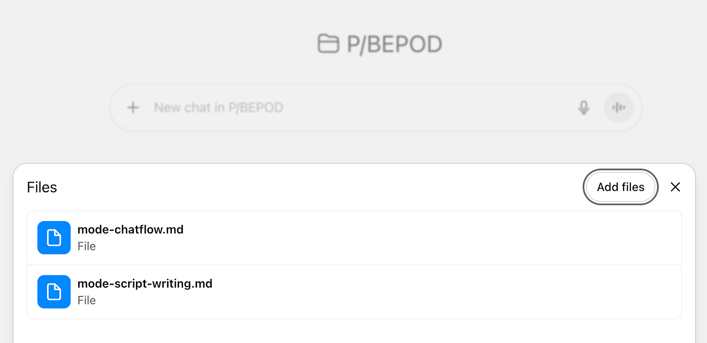 When I start a conversation and realize it's a topic I'll talk about over time, that's where Projects step in. I create it, name it, and upload specific files. Those files are referenced in every conversation I have inside that Project. It's me saying, "Every time I talk to you about this thing in this Project, remember these details."