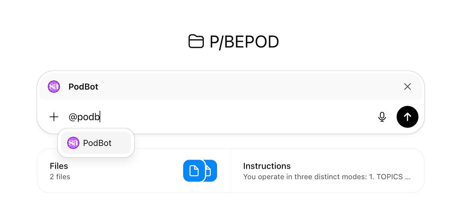 I start inside my Podcast Project, brainstorm or paste notes, call @Pod Bot to turn ideas into my outline, bring in a @Copywriter to draft in my voice, then call @Pod Bot again to reformat the final script into teleprompter lines. Everything automatically stays in the Project folder with full context.